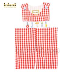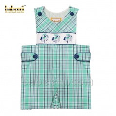 Cute smocked merry-go-round mint navy plaid shortall - BC 930