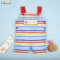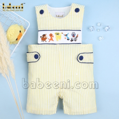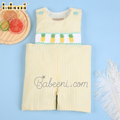 Smocked romper for little boys with pineapple pattern on striped seersucker fabric BC 975